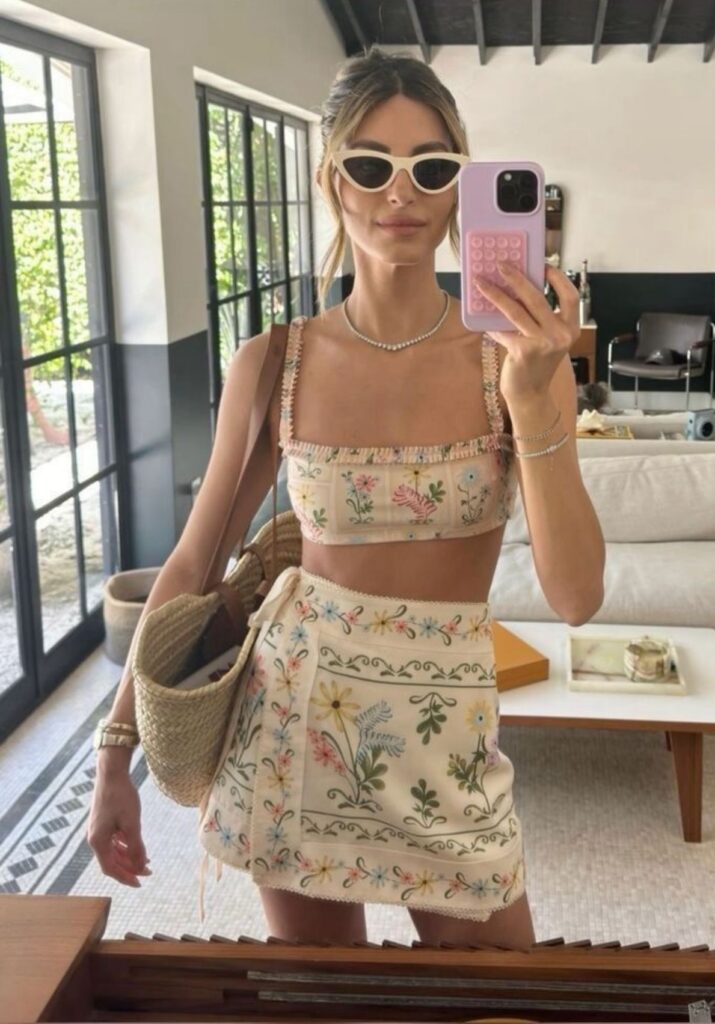 - Try a beige or sage green linen matching set (crop top + wide-leg pants or shorts).